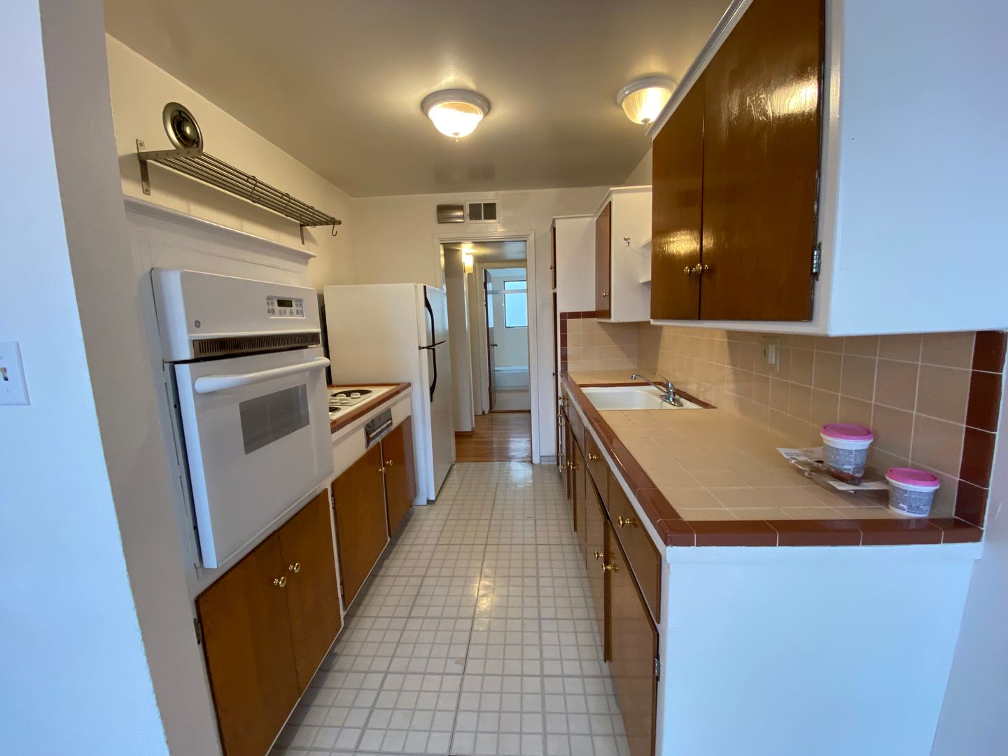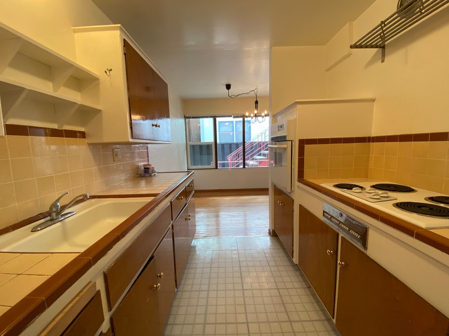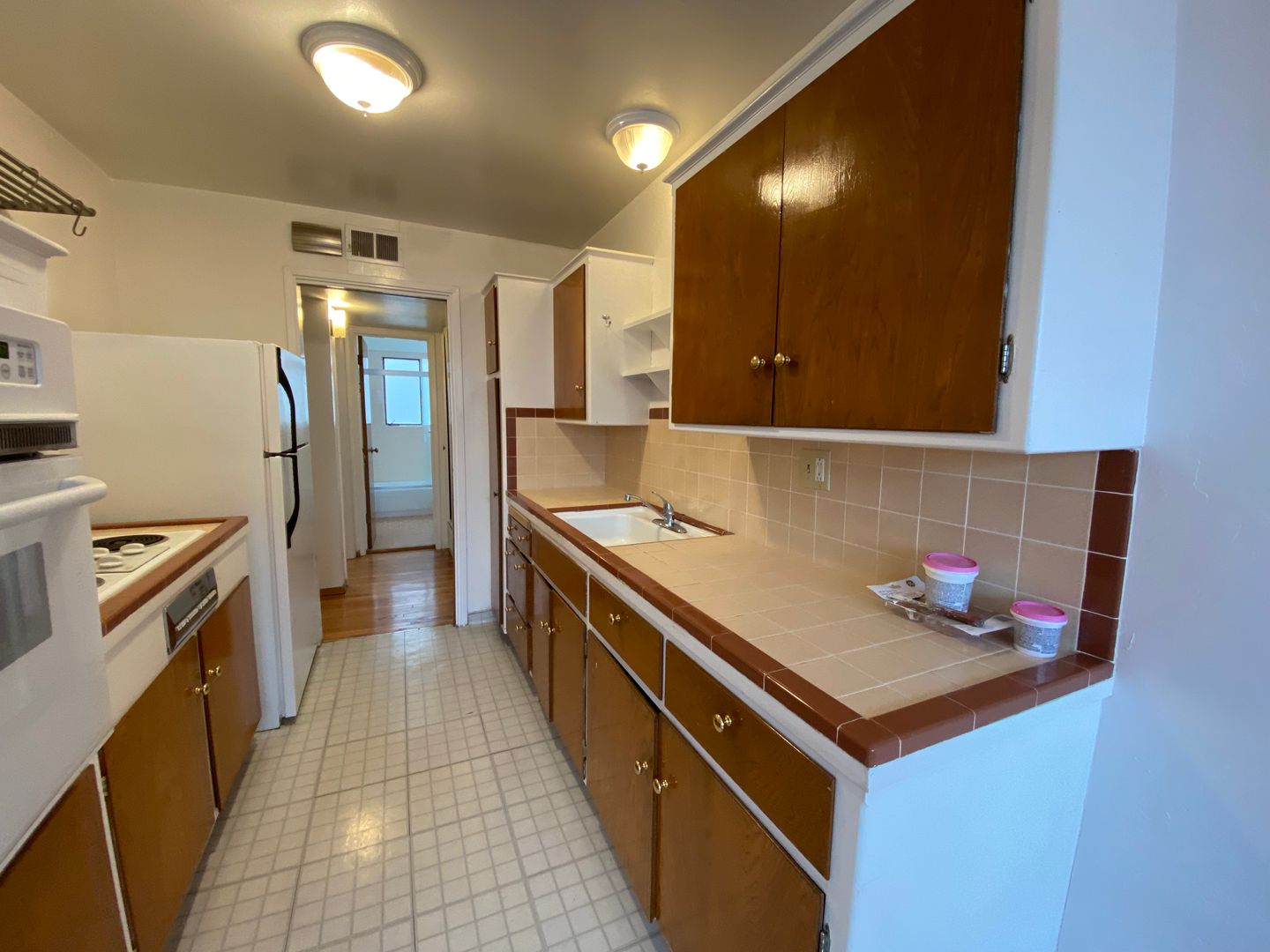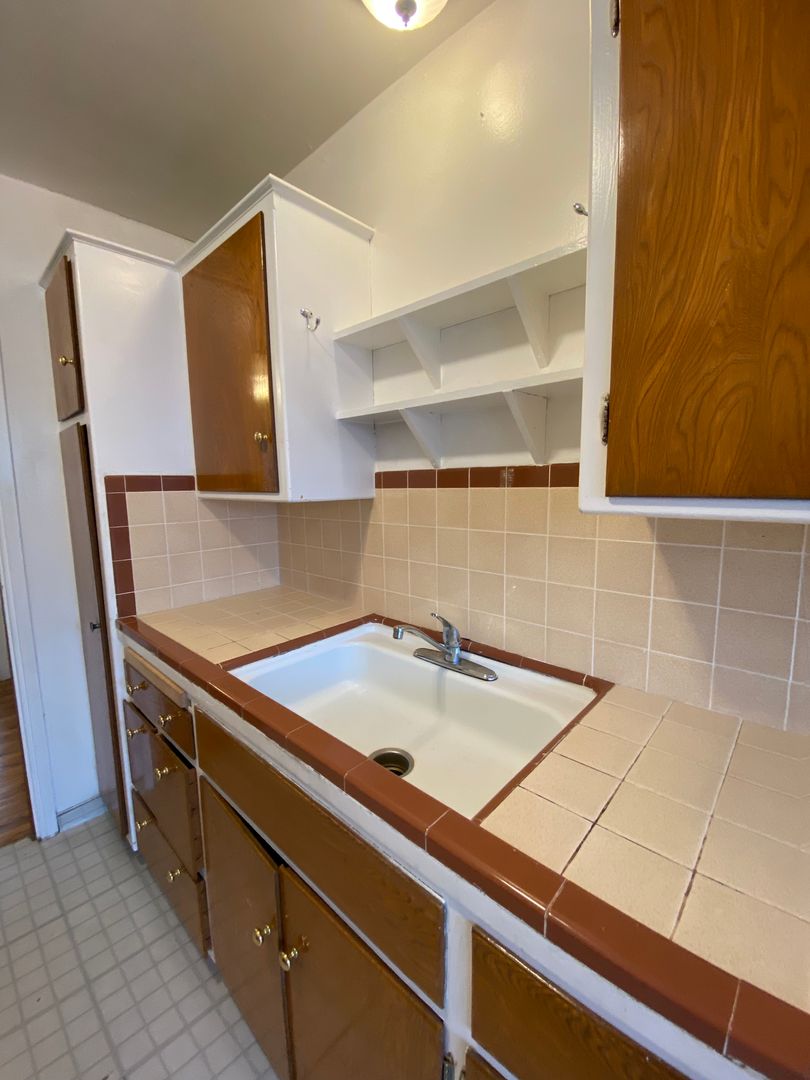 Hardwood runs throughout the apartment and huge windows running the entire length provide great light throughout the day. The kitchen has warm tones, tile countertops, and is nicely designed for a pleasant cooking experience. There is plenty of cabinet space, and a dining area to the side opens up to the living room. In the living room, there's a working fireplace for cozy nights by the fireside. The bedroom is surprisingly large and has room to fit a whole bedroom set. All-tile bathroom.