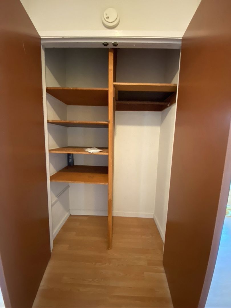 This bright apartment has big South-facing windows, staying well-lit throughout the day. It's a top floor, corner unit with windows on three sides with hardwood floors.