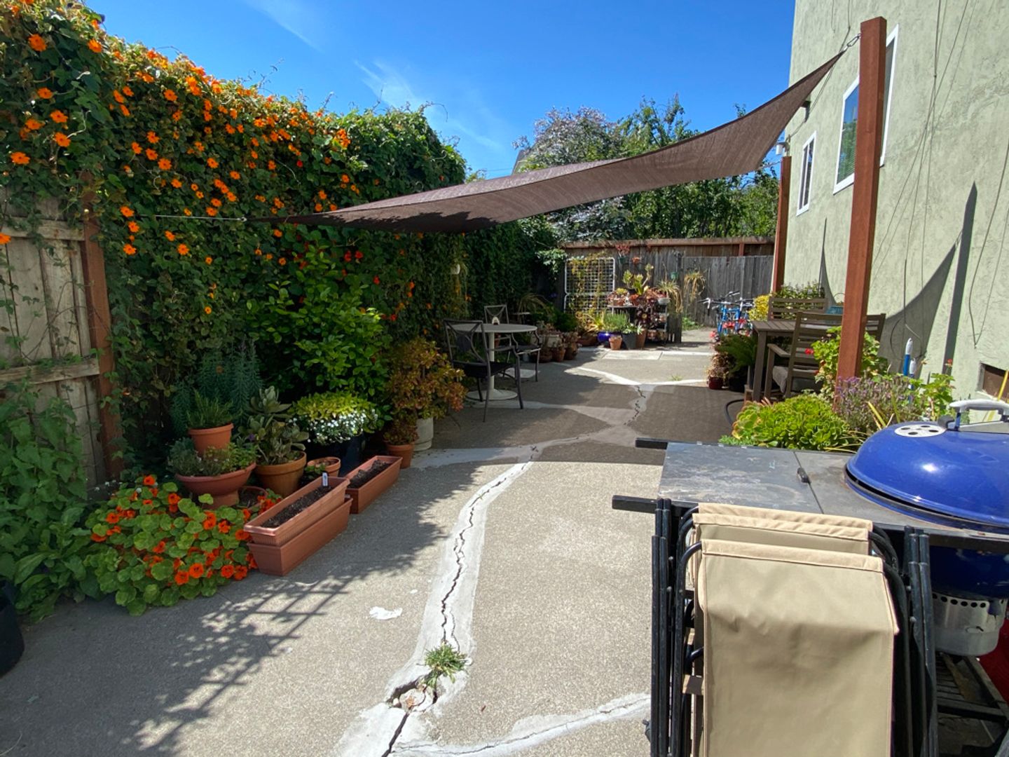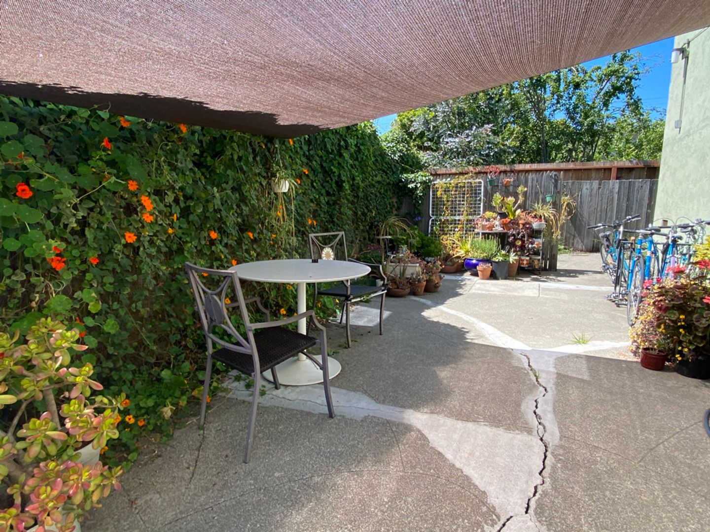 3. Rear yard with bicycle parking and two separate tables with chairs.